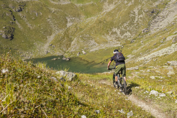 Während ich auf dem Pass sitze und zum gleichnamigen See hinter schaue, kommt plötzlich ein Biker von weiter oben angerauscht. So flott wie der da die ausgesetzten Kehren und Treppenstufen auf dem Pass nimmt, muss es fast ein Local sein. Etwas gemächlicher mach ich mich dann hoch über dem Stausee auf den Weg. Die Aussicht ist wunderbar, aber Flow will nicht so richtig aufkommen und darum werde ich wohl beim nächsten Mal dem Local folgen und die Tour in der Gegenrichtung unter die Räder nehmen.