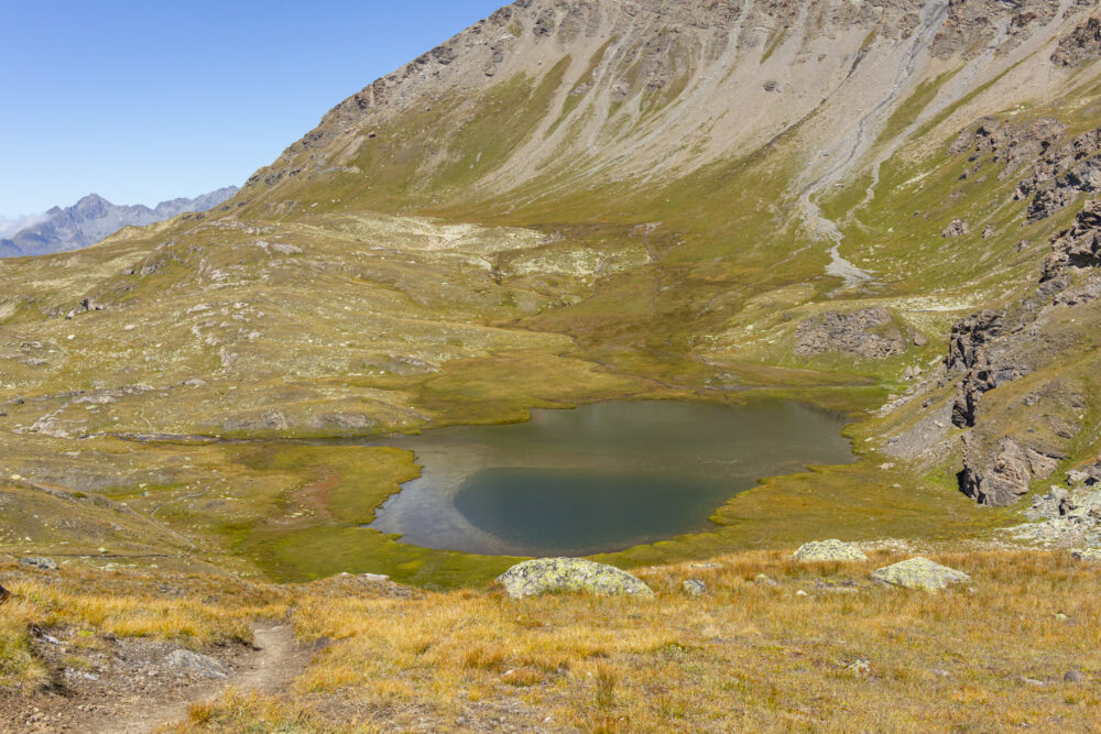 Aus dieser traumhaft schönen Perspektive bekommen die meisten Wanderer den Lac de Louvie nie zu Gesicht, da sie nur bis zur Hütte hochlaufen. In der Ferne funkeln weiss die Gipfel des Grand Combin und ich kann von hier aus auch den Col des Otanes ausmachen, wo wir letztes Jahr unterwegs waren. Die Abfahrt zum See hinunter macht Spass, ist aber leider nicht durchgehend fahrbar. Unten angekommen umrunde ich den See und kehre auf einen kühlen Eistee in der Cabane de Louvie ein, denn die Abfahrt wird heiss.