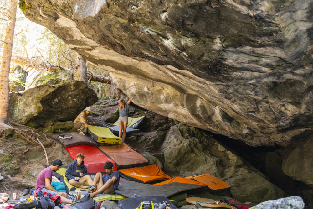 Nach einer ausgiebigen Rast fahre ich zuerst ein Stückchen auf meiner Aufstiegsroute zurück, bevor ich mich bei La Tseumette in die Tiefe stürze. Die Abfahrt nach Bonatchiesse wollte ich schon lange einmal ausprobieren und sie ist ein Volltreffer. Im Wald kurz vor Fionnay stehe ich dann plötzlich vor dieser Bouldergrotte. Der Fels ist einfach traumhaft schön und ich würde mich am liebsten auch gerade daran festkrallen, aber leider habe ich meine Kletterfinken nicht dabei.