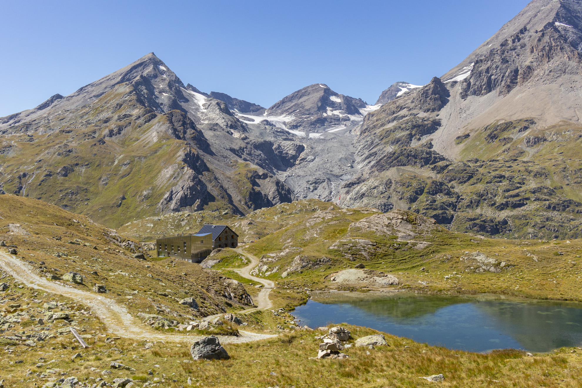 Am zweiten Tag nehme ich den Bus bis zur Staumauer und pedaliere von da aus dem Lac de Mauvoisin entlang bis zu dessen Ende. Ich folge weiter dem Alpsträsschen, welches mich zur Cabane de Chanrion bringt. Von hier aus habe ich einen super Blick hinüber zum Fenêtre de Durand und zum Aprilberg, wo ich auch schon war. Nun trennt mich nur noch ein letzter steiler Aufstieg vom Col de Tsofeiret, welcher den heutigen Kulminationspunkt darstellt.