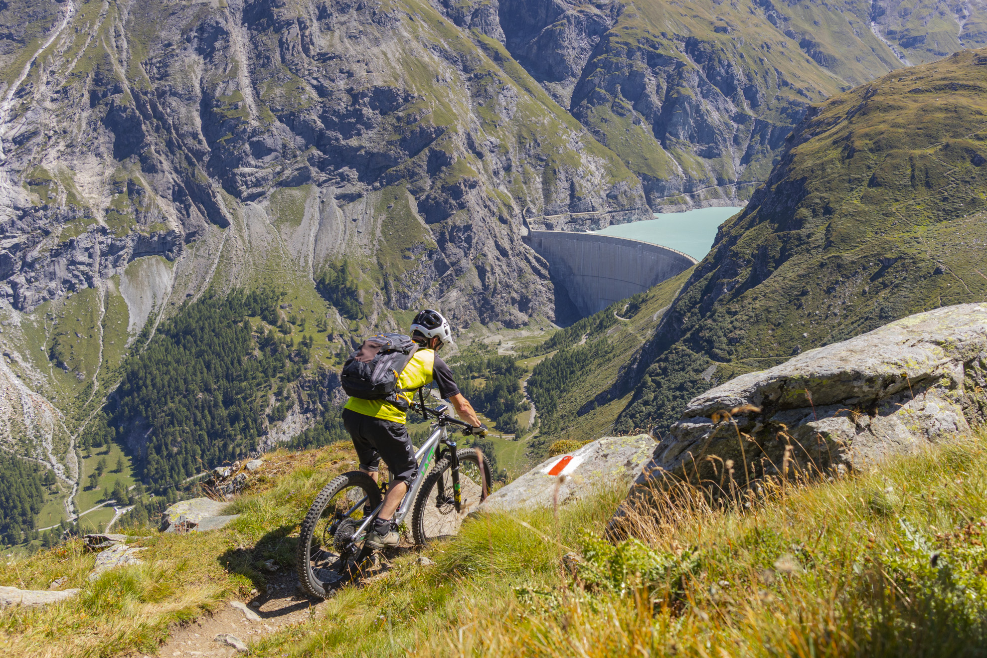 Was nun folgt ist schlichtweg der Hammer, über 800 Tiefenmeter und unzählige Kehren schlängelt sich der Weg nach Fionnay hinunter. Bis auf einzelne Stellen ist alles fahrbar, da juchzt das Bikerherz. Aber ich befinde mich hier auf Trailrunner-Territorium und ernte trotz freundlichem zur Seite stehen nicht nur nette Kommentare. Darum rate ich dazu den Weg nicht in der Hauptsaison und nur an Randzeiten zu befahren, da es sonst für alle Beteiligten keinen Spass macht.